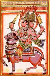 Les enseignements que nous avons sur les pratiques religieuses de l’Inde antique nous sont fournis par des livres datant de 1000 ans av JC. Ces livres sont appelés les vedas, ce qui signifie “savoir religieux”. Ces ouvrages sont rédigés en sanskrit et c’est par eux que nous apprenons que les divinités adorées par les habitants du sud de l’Inde étaient identifiées aux éléments naturels : le feu, le ciel, la lumière, le vent, l’eau, la terre. Ces divinités personnifiées portaient chacune un nom. Le dieu du feu a été pendant longtemps la divinité la plus importante, symbolisant à la fois le feu domestique et le feu allumé pour un sacrifice, celui d'un animal, principalement le cheval, représenté avec deux têtes.