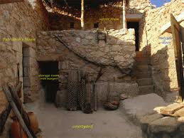 Le toit de la maison, de branchages et de terre glaise, sert de terrasse. On y dort, on s’y retrouve pour causer, ou pour prier. Le sol de la maison est d’ordinaire en terre battue. Au fronton de la porte, en bois, pend la mezouza, un tube contenant un parchemin sur lequel était écrit le texte du Dt 6, 4-9 (le fameux “Shema Israël”).